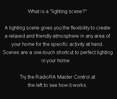 Why not enjoy the best light staging every day, for every activity, with just a single touch? Why should your home look its best only for others? You deseverve the convenience, enjoyment, and safety of immediate control of lighting scenes. Go from theater lighting to path lights for safe walking without interrupting the entertainment, or raise the room lights after the movie. Have a quick ALL ON for those moments when you think you hear some suspicious noise in the night. And how about office lighting that knows the difference between a quiet nighttime computer or desk task and a whole-room project? Lighting scenes are the answer. TRY IT - Click the top